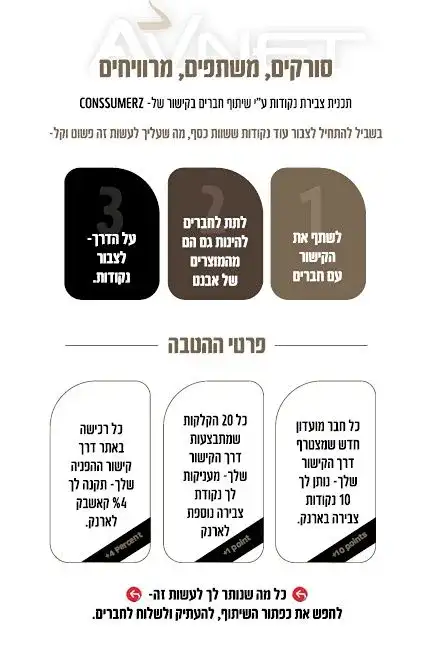 לקוחות אבנט מרוויחים ובגדול! שתפו לחברים ותצברו עוד נקודות לרכשיה בחנות "אבנט"