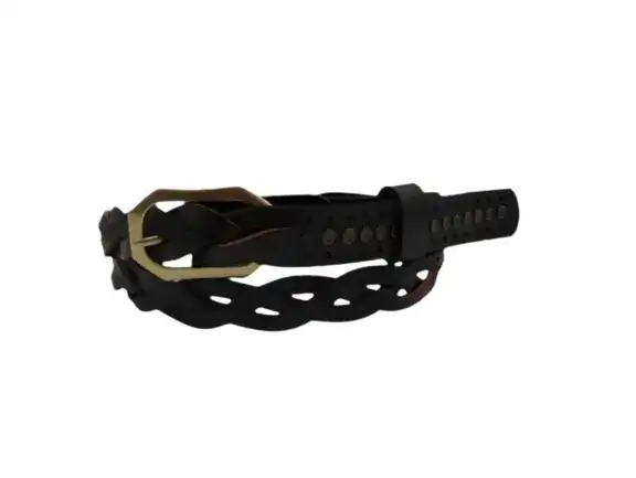 חגורת עור צרה בצבע שחור עם שיבוץ ניטים זהובים וקליעת עור. חגורת עור צרה בצבע שחור עם שיבוץ ניטים זהובים וקליעת עור.מחיר רגיל: ILS 280.00