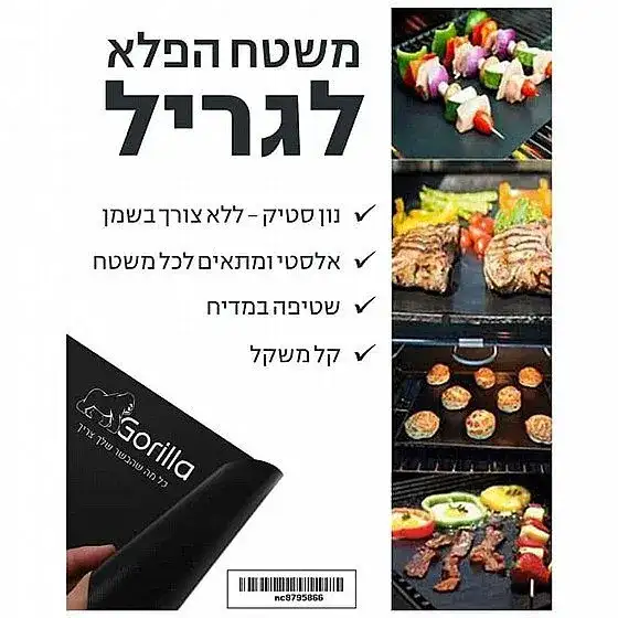 שטח הקסם - משטח צליה מטפלון .מהיום, סוף סוף אין צורך לעמוד לנקות ולשפשף את המנגל לפני ואחרי כל שימוש השימוש במשטח הצליה מטפלון מאפשר שימוש פשוט, נוח ונקי בזמן הכנת הבשר. פשוט הניחו את משטח הצליה על המנגל ולאחר סיום הכנת הבשר פשוט העבירו לכיור ושתפו במים וסבון. שכבת הטפלון הגמישה מותירה את המנגל נקי וללא לכלוך.מחיר רגיל: ILS 39.00